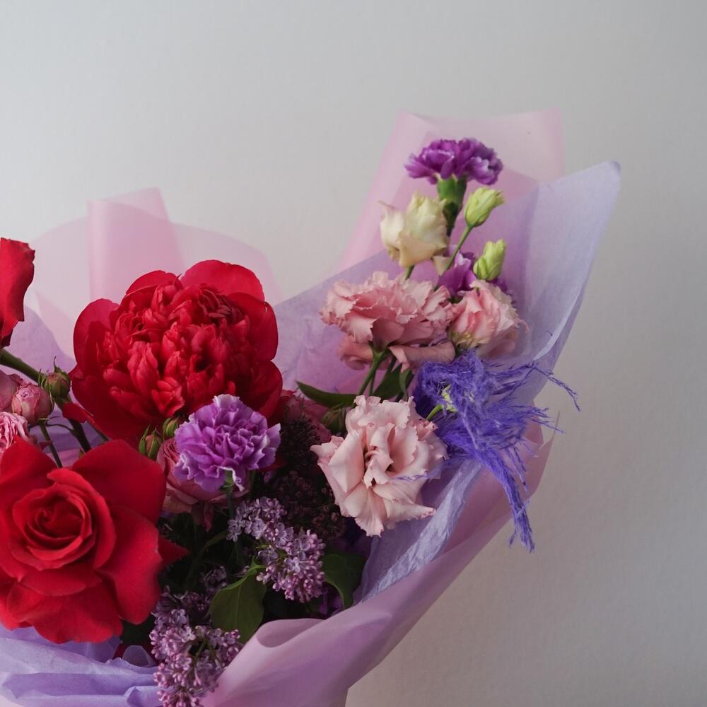 Пион – 1 шт.Роза французская – 2 шт.Роза кустовая – 2 шт.пампасная трава – 2 шт.Диантус – 4 шт.лизаантус – 2 шт.Сирень – 1 шт.Упаковка дизайнерская – 1 шт.