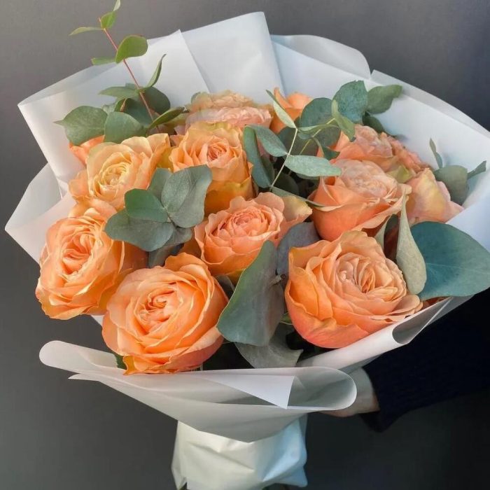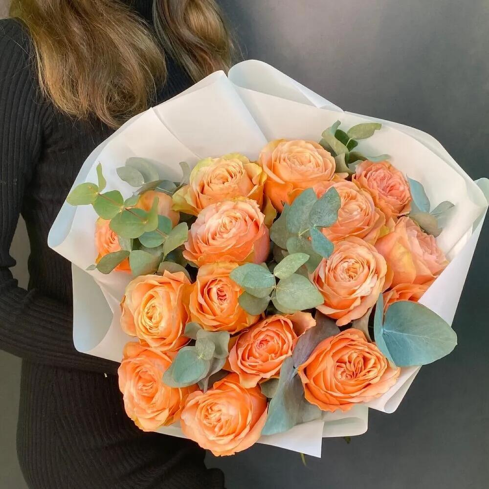 Эвкалипт – 7 шт.Роза Эквадор – 15 шт.Лента атласная – 1 шт.Упаковка дизайнерская – 5 шт.