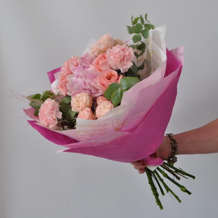 Гортензия – 1 шт.Лимониум – 1 шт.Эвкалипт – 1 шт.Гвоздика – 3 шт.Лента атласная – 1 шт.Роза пионовидная – 3 шт.Кустовая пионовидная роза – 2 шт.Крафт упаковка – 2 шт.Ковыль – 3 шт.Крафт жатый – 2 шт.