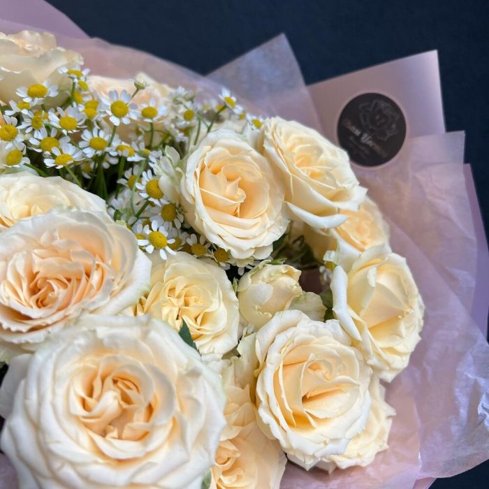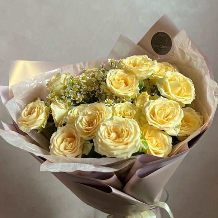 Кустовая роза – 3 шт.Танацетум – 3 шт.декоративная упаковка – 1 шт.Атласная лента – 1 шт.