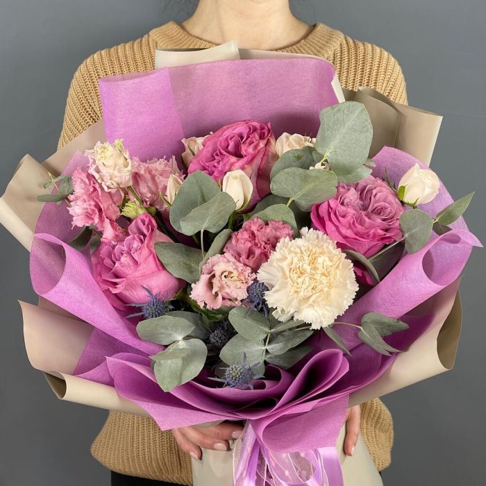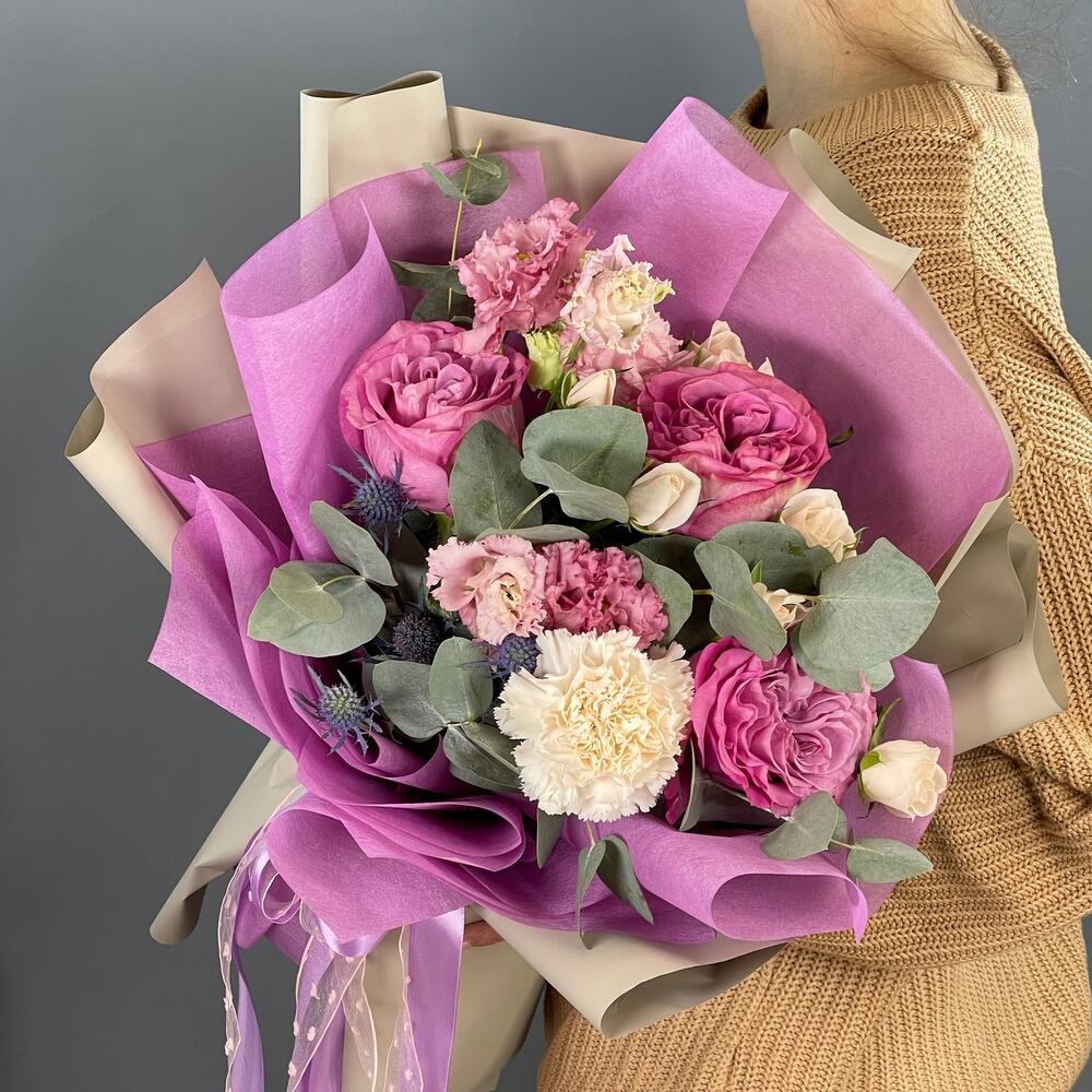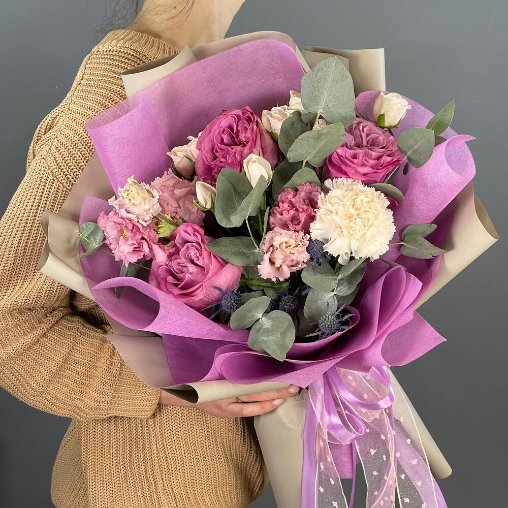 Лента – 2 шт.Лизиантус – 1 шт.Роза кустовая – 2 шт.Эвкалипт – 2 шт.Эрингиум – 1 шт.Роза одноголовая – 3 шт.Упаковка дизайнерская – 2 шт.Гвоздика одноголовая – 1 шт.
