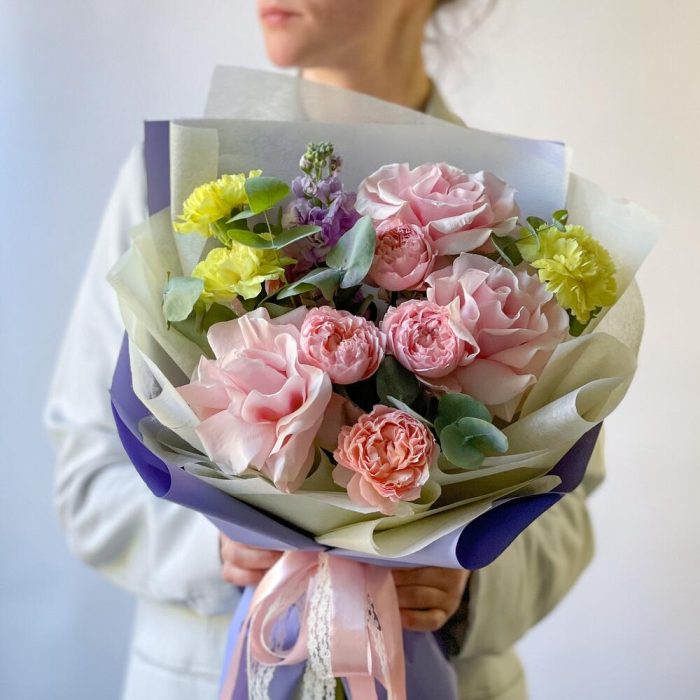 Лента – 1 шт.Маттиола – 1 шт.Роза кустовая – 1 шт.Эвкалипт – 1 шт.Роза одноголовая – 3 шт.Гвоздика – 3 шт.Упаковка дизайнерская – 1 шт.