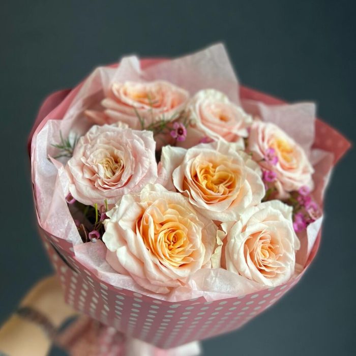 Роза – 7 шт.Хамелациум – 2 шт.декоративная упаковка – 1 шт.Атласная лента – 1 шт.