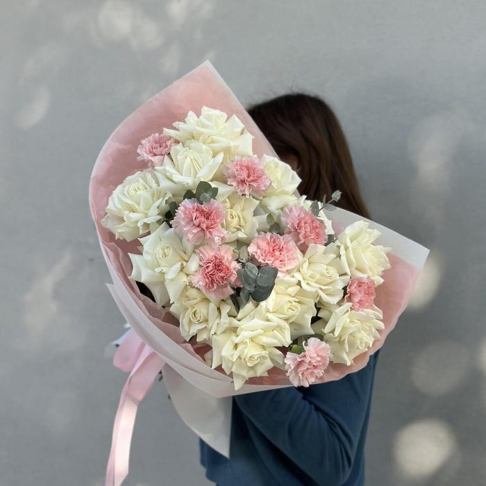 Роза – 13 шт. Гвоздика – 8 шт. Эвкалипт – 2 шт.