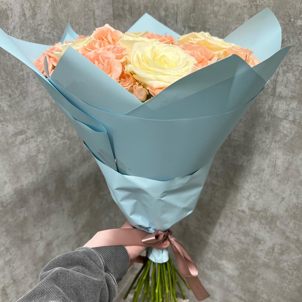 Роза кустовая – 20 шт.Лента атласная – 1 шт.Упаковка дизайнерская – 1 шт.Роза аваланж 50 см – 7 шт.