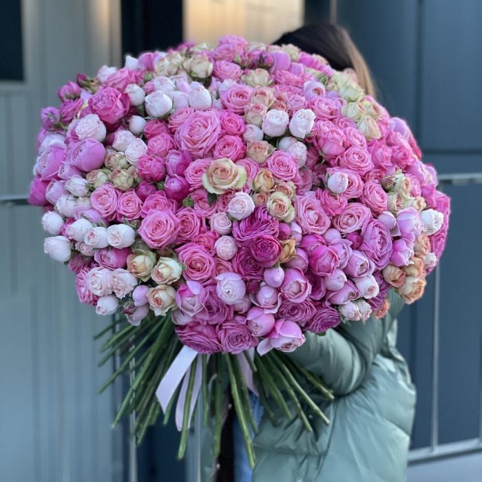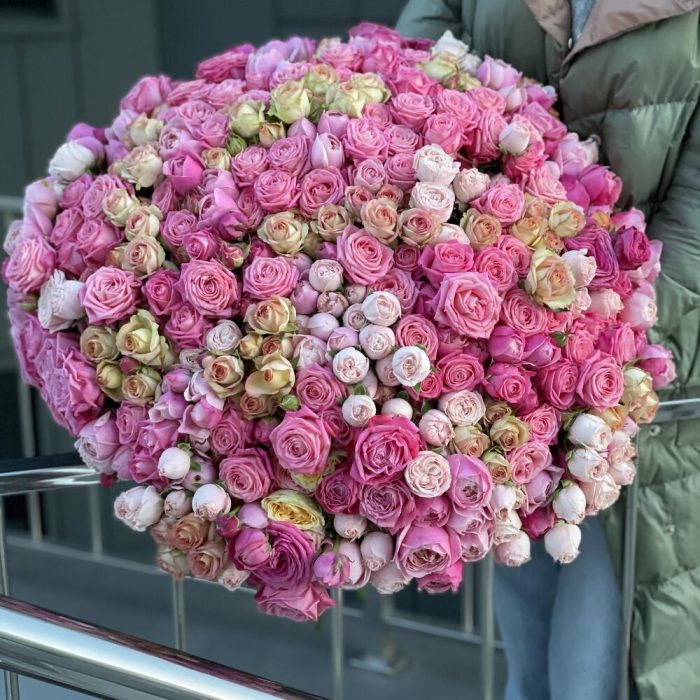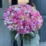 Кустовая роза – 101 шт. оформление – ленты – 1 шт.
