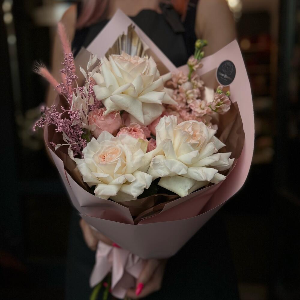 Пионовидная роза – 3 шт.Маттиола – 2 шт.Кустовая пионовидная роза – 1 шт.Перо – 1 шт.Лагурус – 4 шт.Рускус – 1 шт.Сухоцветы – 2 шт.декоративная упаковка – 1 шт.Атласная лента – 1 шт.