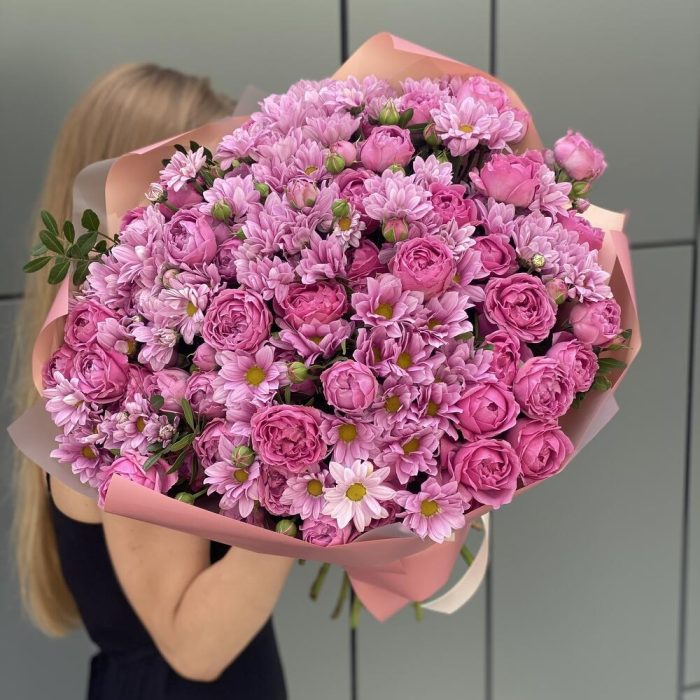 Хризантема гранд пинк – 14 шт. кустовая пионовидная роза misty bubbles – 10 шт. Писташ – 5 шт. Оформление – 1 шт.