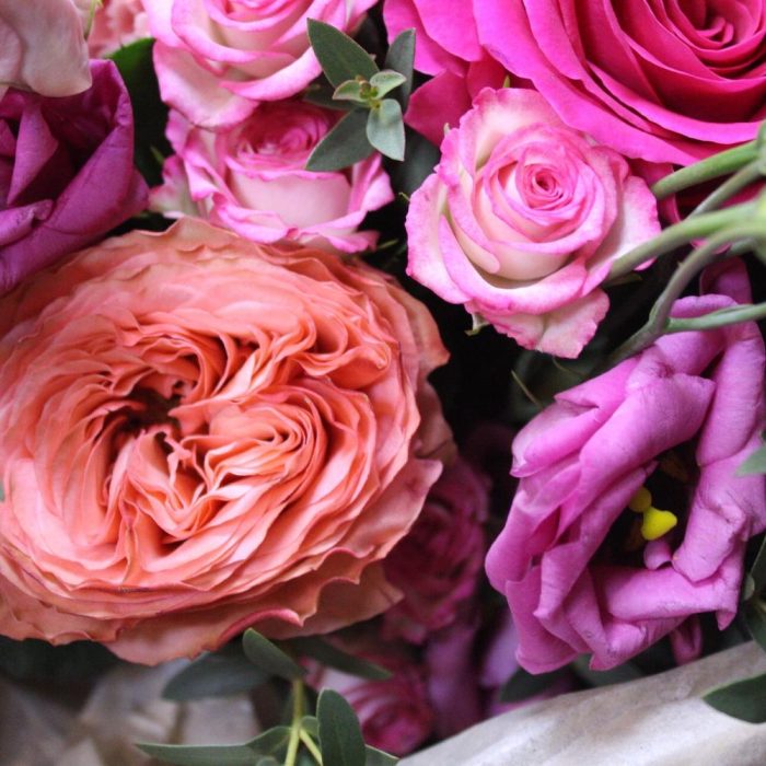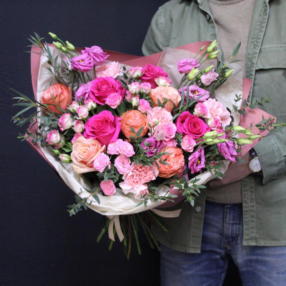 Роза пионовидная кахала – 5 шт.роза кустовая пионовидная леди бомбастик – 5 шт.Эвкалипт – 5 шт.Роза Pink Floyd – 4 шт.Диантус – 4 шт.Эустома – 3 шт.Пленка матовая – 3 шт.Лента атласная – 2 шт.Тишью – 2 шт.