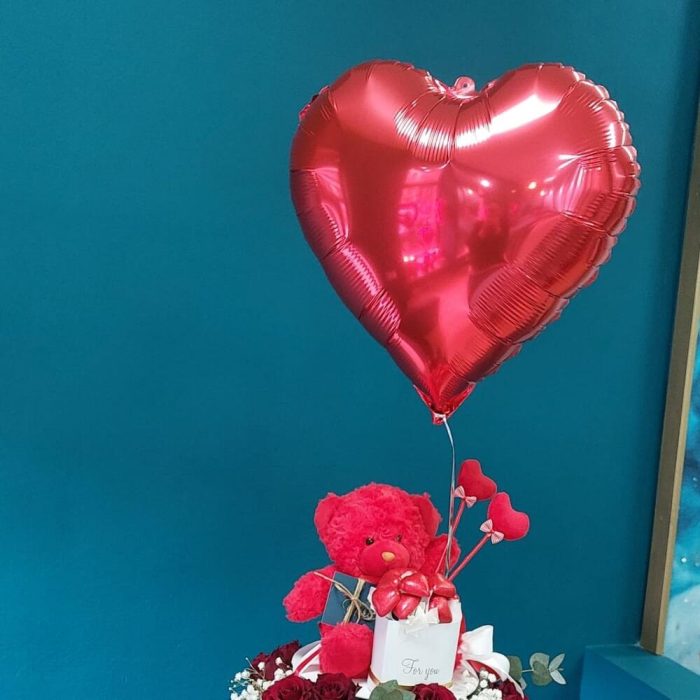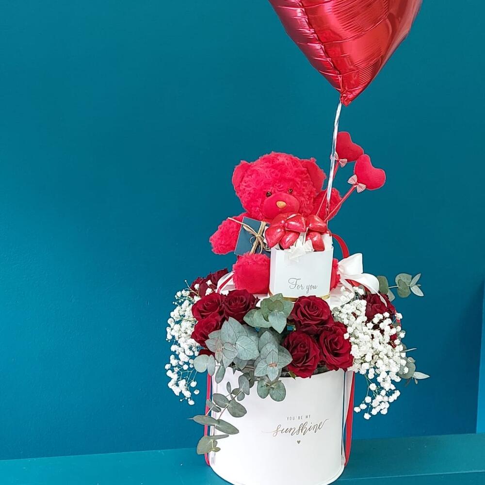 Гипсофила – 2 шт. Эвкалипт – 1 шт. Роза – 11 шт. Коробка шляпная – 1 шт. Медведь плюшевый – 1 шт. серца серца – 1 шт.