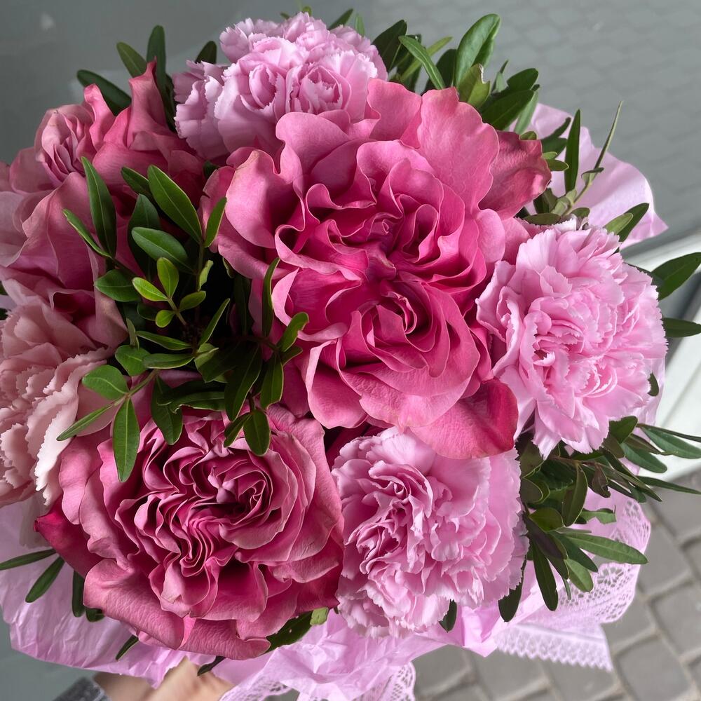 Гвоздики, Кустовые розы, Пионовидные розы, Розы