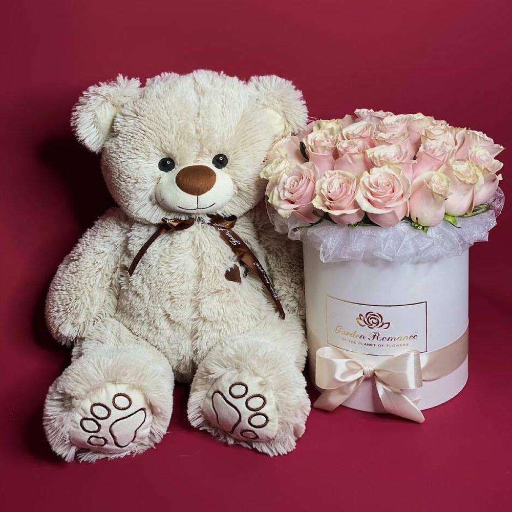Коробка шляпная – 1 шт.Флористическая губка – 1 шт.Роза эквадор 50 см – 25 шт.мягкая игрушка медведь 50 см – 1 шт.