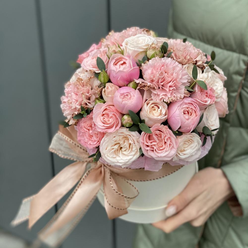Композиция из кустовой розы, сортовой гвоздики и эвкалипта !