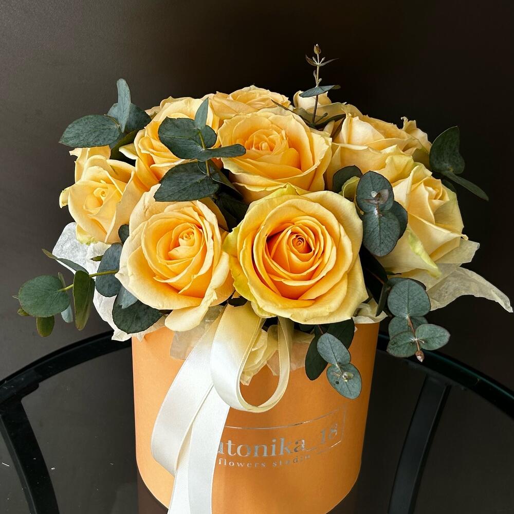 Композиция в коробке из 15 персиковых роз и ароматного эвкалипта
