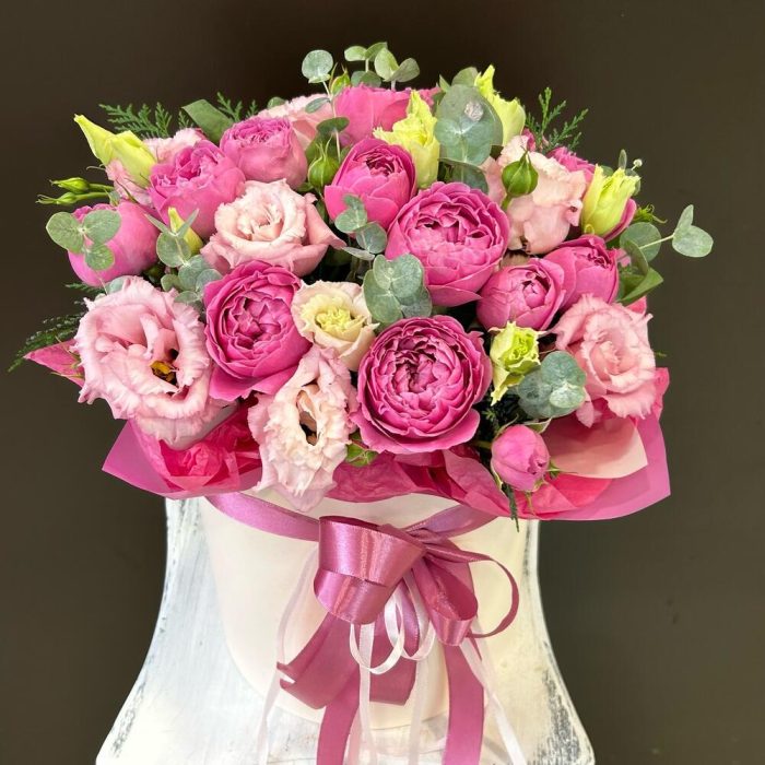 Коробка шляпная – 1 шт.Пиафлор (оазис) – 1 шт.Лента атласная – 3 шт.Роза кустовая пионовидная – 10 шт.Эустома – 5 шт.Эвкалипт – 4 шт.Зелень – 5 шт.Упаковка – 3 шт.