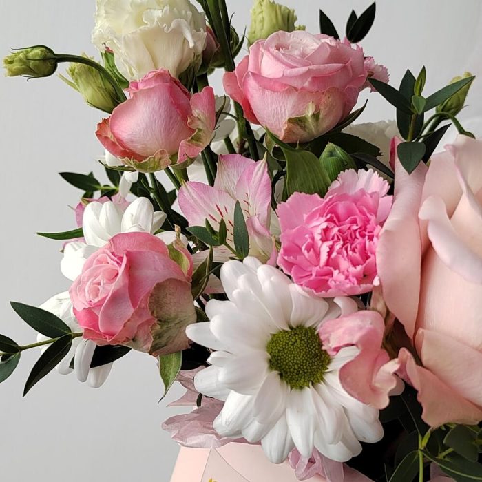 Композиция в коробке из роз, хризантемы и эустомы