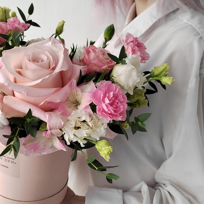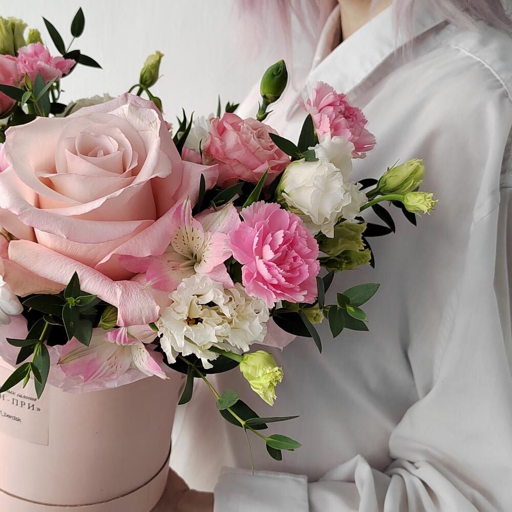 Роза кустовая – 1 шт.Хризантема кустовая – 1 шт.Роза – 1 шт.Эустома – 2 шт.Коробка шляпная – 1 шт.Гвоздика кустовая – 3 шт.Эвкалипт первифолиа – 3 шт.