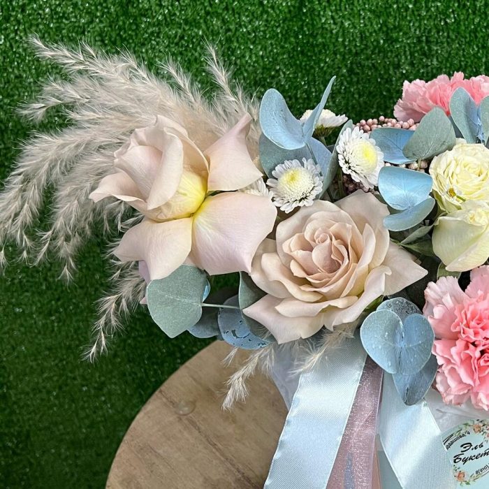 Роза кустовая – 2 шт.Эвкалипт – 6 шт.Ромашка – 1 шт.Эустома – 2 шт.Диантус – 2 шт.Коробка шляпная – 1 шт.Сухоцветы – 2 шт.Роза Мента – 3 шт.Губка флористическая – 1 шт.