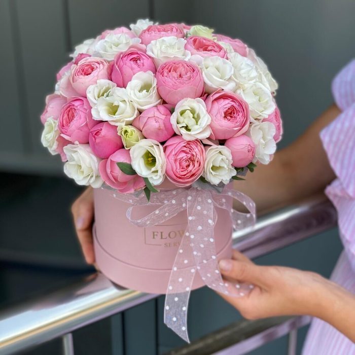 Композиция из кустовых пионовидных роз и белой эустомы в коробке !