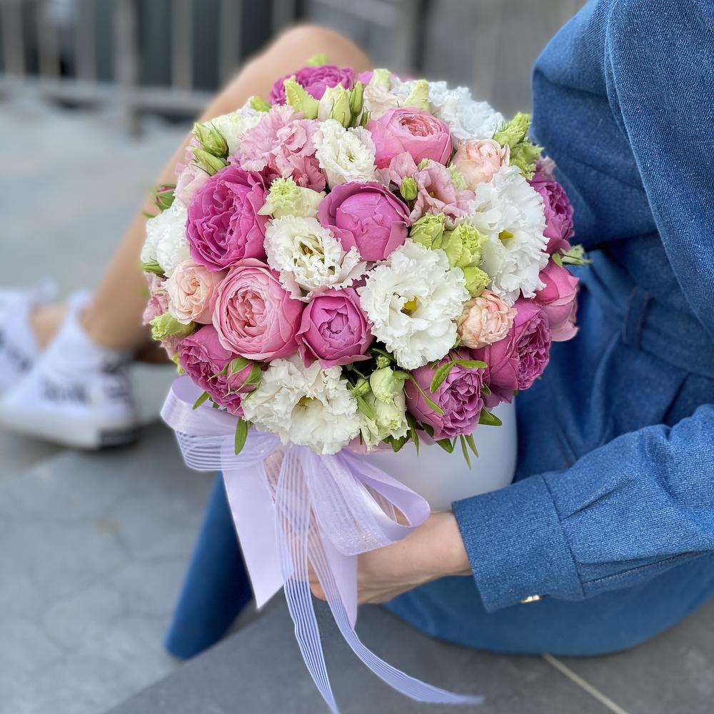 Коробка шляпная – 1 шт. Оазис – 1 шт. Лента – 2 шт. Misty Bubbles пионовидная роза – 3 шт. Сильвия – 2 шт. Бомбастик роза – 1 шт. Писташ – 1 шт. Эустома алиса – 4 шт.