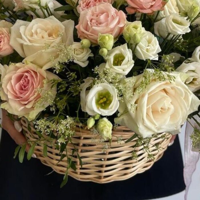Роза Эквадор – 17 шт.Лента атласная – 2 шт.Фисташка – 7 шт.Корзина плетеная – 1 шт.Оазис флористический – 2 шт.эустома белая – 10 шт.Кустовая роза пионовидная – 10 шт.