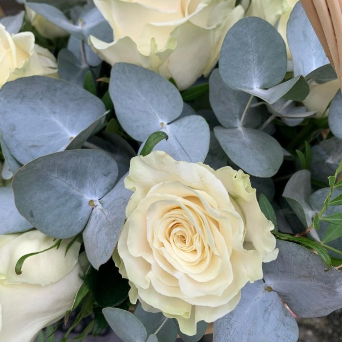 Корзина с белыми розами и эвкалиптом Эвкалиптовый лес