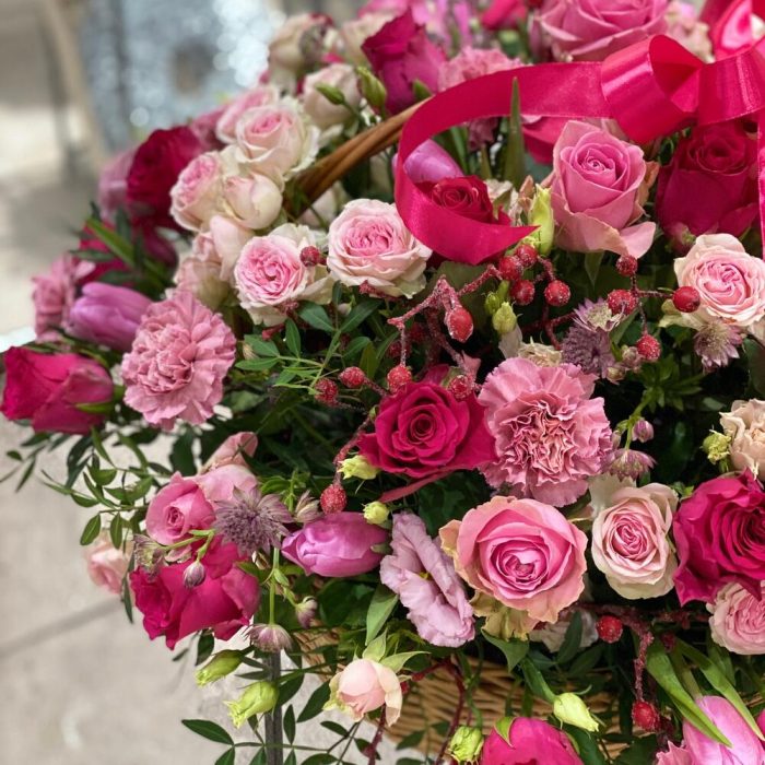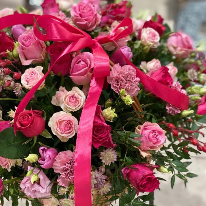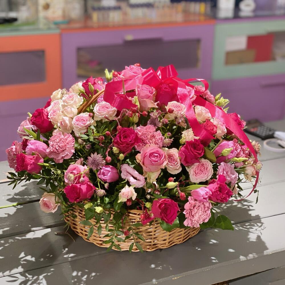 Роза малиновая – 20 шт.Роза розовая – 13 шт.Роза кустовая пионовидная – 4 шт.Астранция – 5 шт.Диантус сортовой – 10 шт.Тюльпан – 8 шт.Хиперикум – 4 шт.Лизиантус алиса пинк – 6 шт.Фисташка – 8 шт.Корзина плетеная – 1 шт.Оазис флористический – 3 шт.Упаковка – 1 шт.бант атласный – 1 шт.