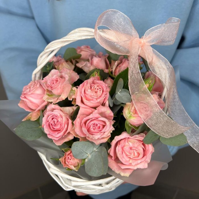 Роза кустовая пионовидная – 4 шт.Корзина плетеная – 1 шт.комплимент от polyanka – 1 шт.