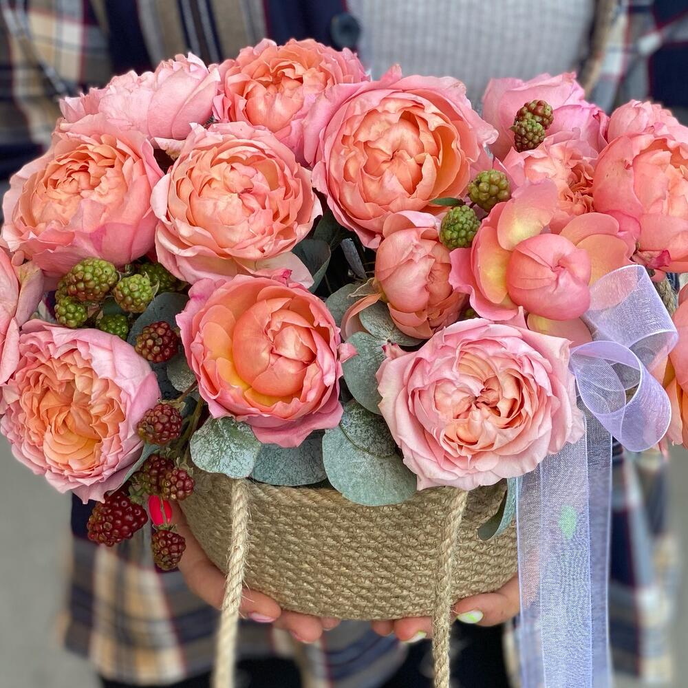 Эвкалипт – 3 шт.Роза кустовая пионовидная – 5 шт.кашпо джутовое ручной работы – 1 шт.
