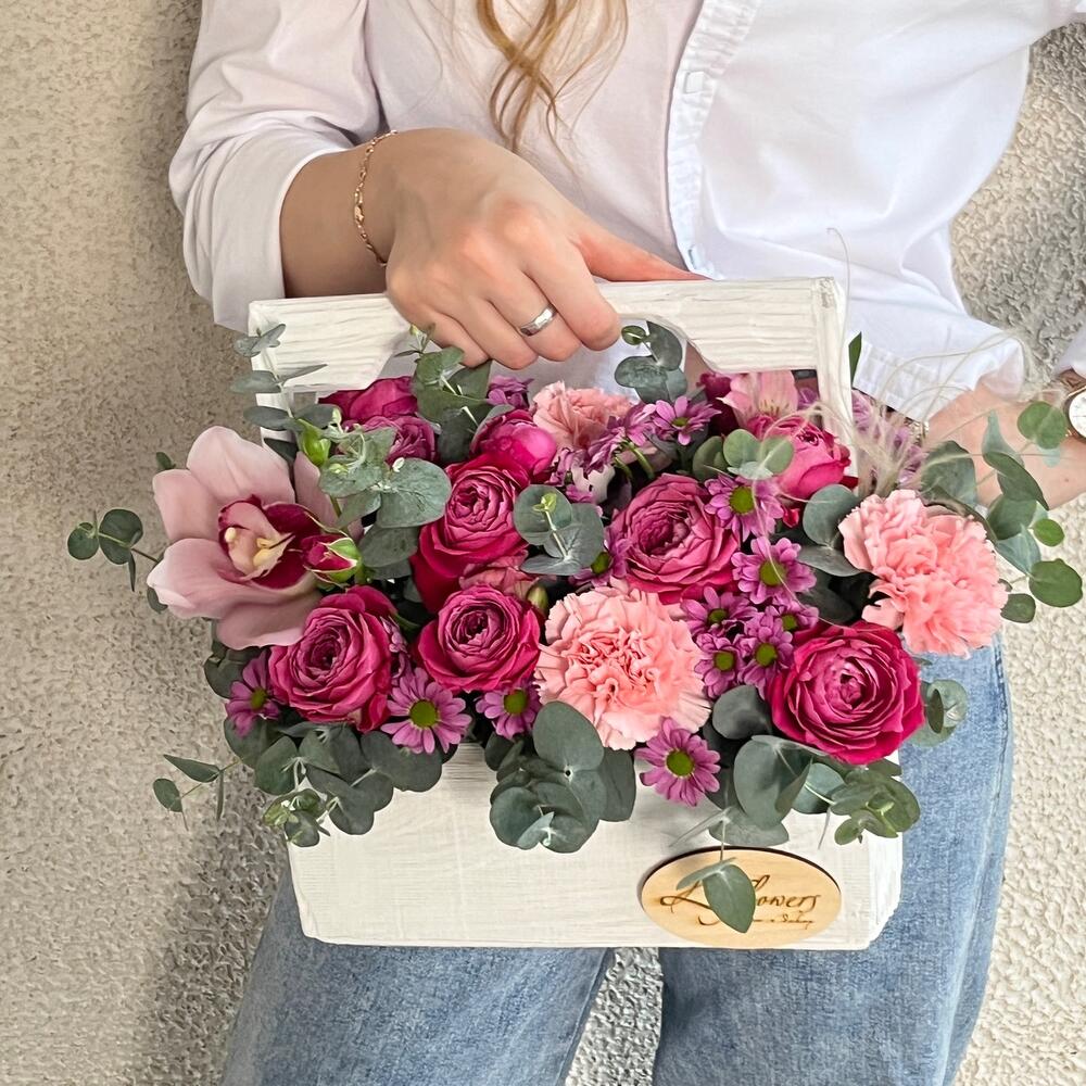 орхидея на удлинителе – 1 шт.Диантус – 5 шт.Сантини – 4 шт.Роза кустовая – 3 шт.пеннисетум – 1 шт.Альстромерия – 1 шт.Ящик – 1 шт.