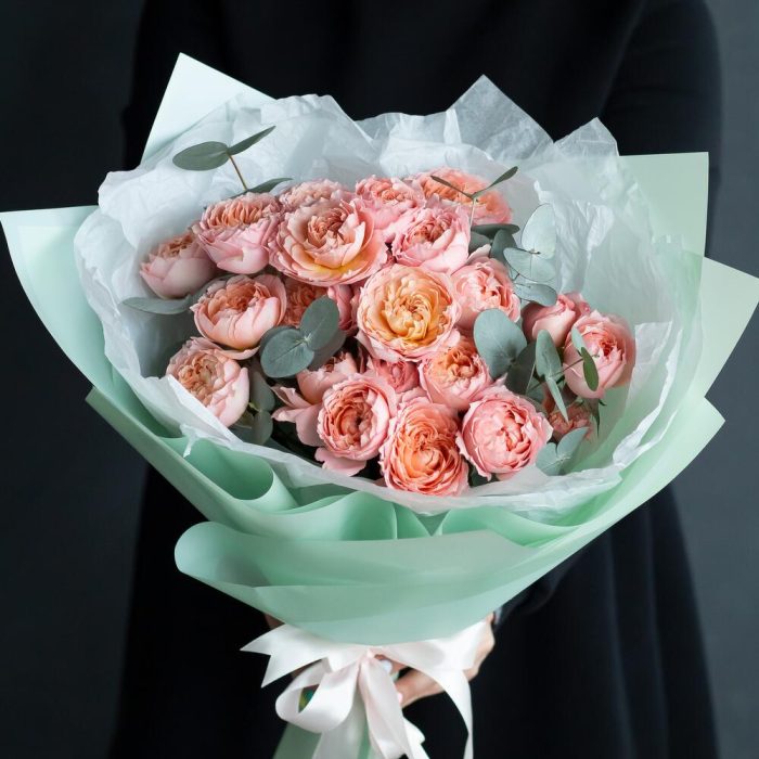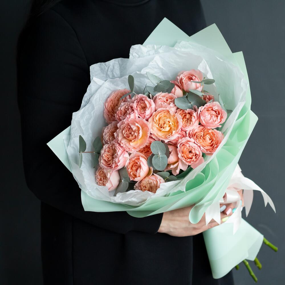 Монобукет пионовидных кустовых роз сорта Мисти Бабблс