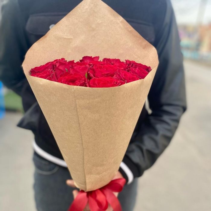 Роза красная – 15 шт.Лента атласная – 1 шт.Крафт упаковка – 1 шт.