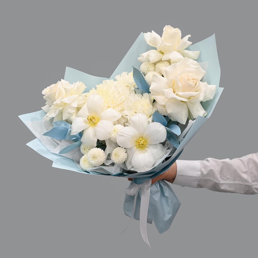 Небесно голубой букет с тюльпагами и французской розой