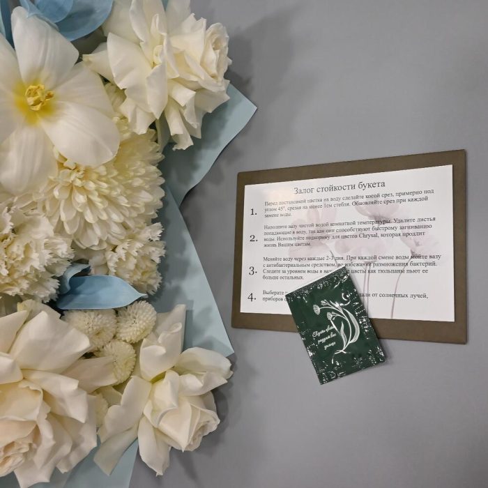 - Сроки возврата: Претензии по качеству букета принимаются в течение 24 часов с момента его получения.