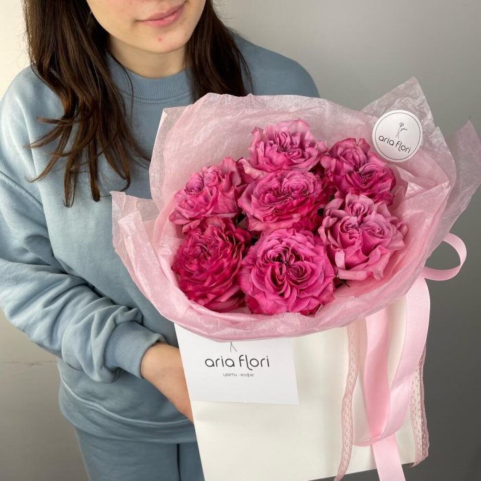Роза Эквадор – 7 шт.Упаковка дизайнерская – 1 шт.Сумочка – 1 шт.любовь флориста – 1000 шт.записка с вашим текстом – 1 шт.советы по уходу за срезанными цветами – 1 шт.шоколадный медиан ручной работы – 1 шт.