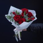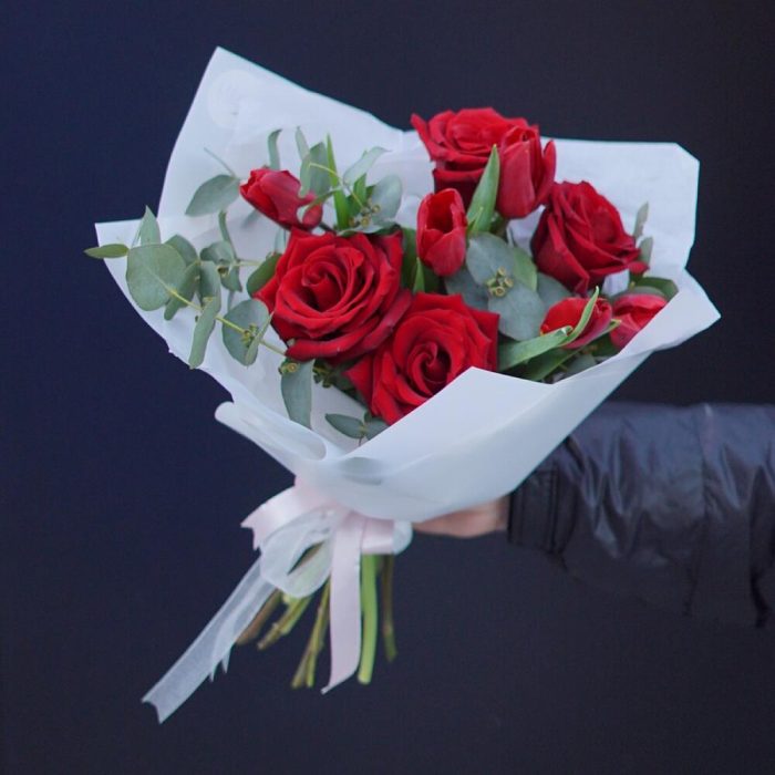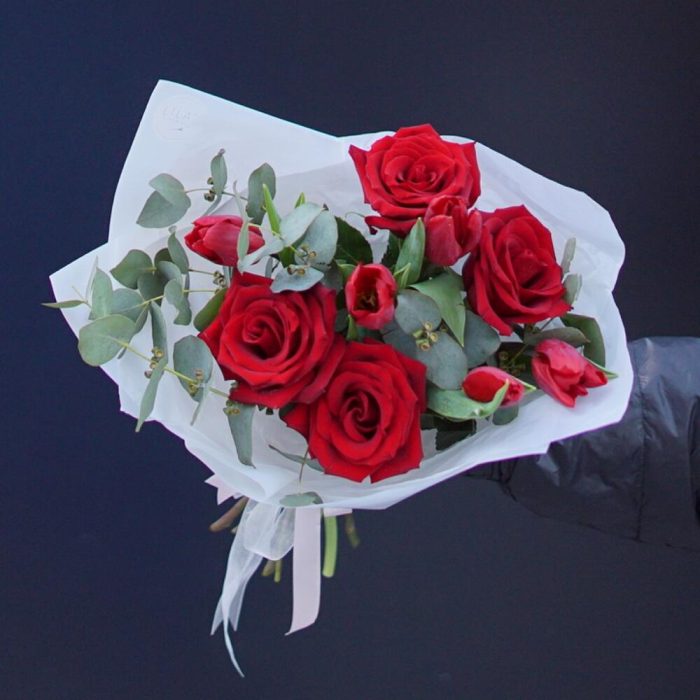 Роза красная – 4 шт. Тюльпан – 4 шт. Эвкалипт – 3 шт. Упаковка дизайнерская – 1 шт. Открыточка с вашими пожеланиями – 1 шт. инструкция по уходу за цветами – 1 шт.