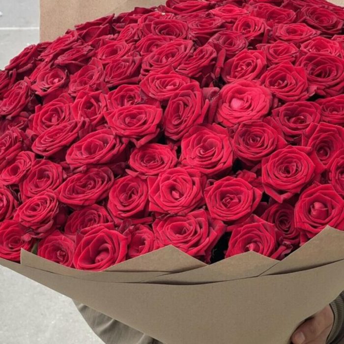 розы эквадор (60 см) – 75 шт.Крафт упаковка – 3 шт.Лента атласная – 1 шт.