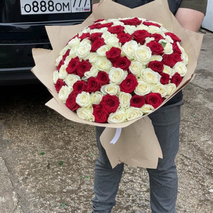 розы эквадор (60 см) – 71 шт.Крафт упаковка – 3 шт.Лента – 1 шт.