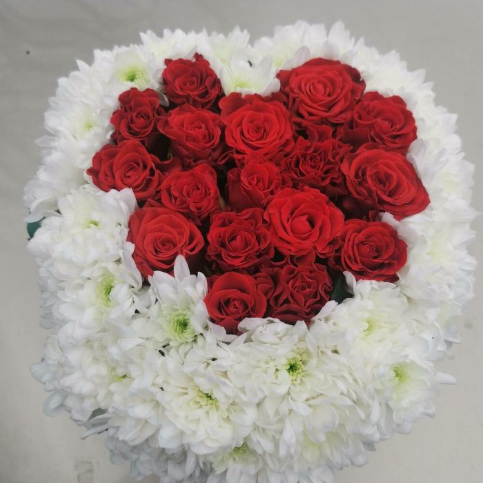 Яркое сердце из 17 красных роз и 4 веток белоснежной хризантемы. Очень нежный и привлекательный букет в форме сердца.