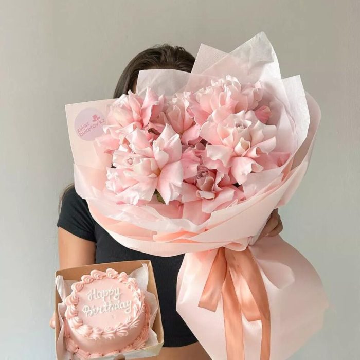 Моно букет из роз и бенто тортик! Дизайн торта можно заменить на Ваш выбор