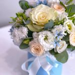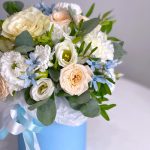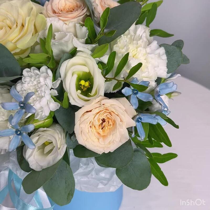 Шляпная коробка с цветами в бело-голубой гамме – отличный презент. Подойдёт по любому поводу: и в качестве пожелания хорошего дня, и для поздравления с днём рождения. В составе композиции использованы стойкие цветы. Они находятся в специальной флористической губке и не … Показать ещётребуют перестановки в вазу. Необходимо раз в 1-2 дня аккуратно подливать воду