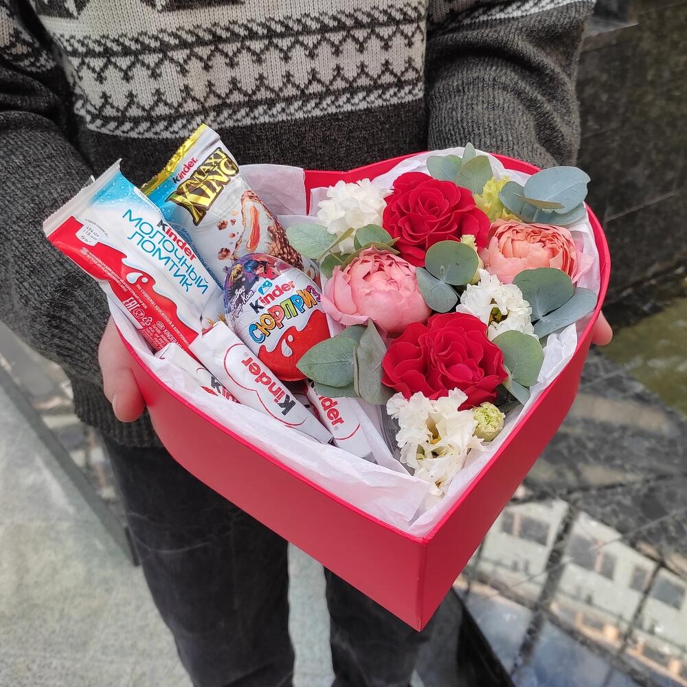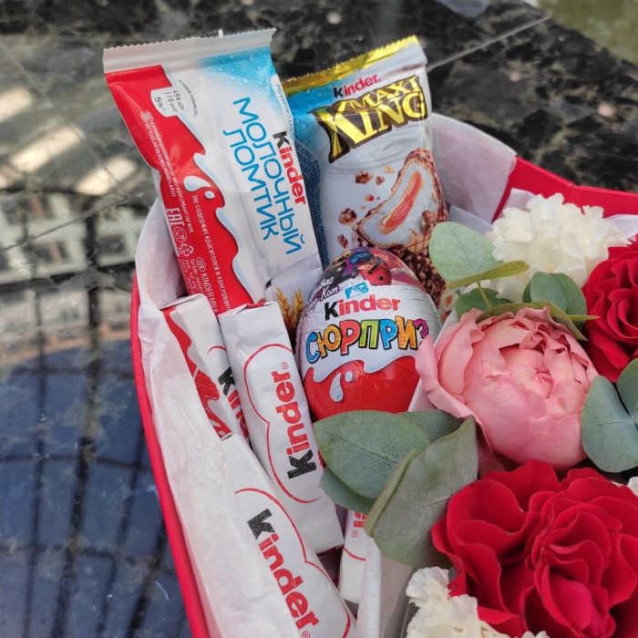 Лизиантус – 1 шт.Эвкалипт – 1 шт.Роза – 2 шт.Тишью – 2 шт.Роза кустовая пионовидная – 1 шт.Киндер сюрприз – 1 шт.Коробка сердце – 1 шт.Киндер шоколад – 7 шт.Киндер макси – 1 шт.Киндер молочный ломтик – 1 шт.