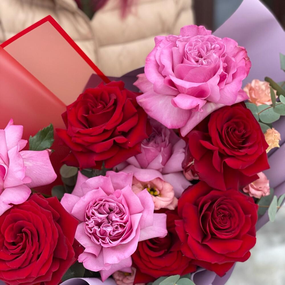 Роза Эквадор – 7 шт.Эустома – 2 шт.Эвкалипт – 1 шт.Упаковка – 1 шт.