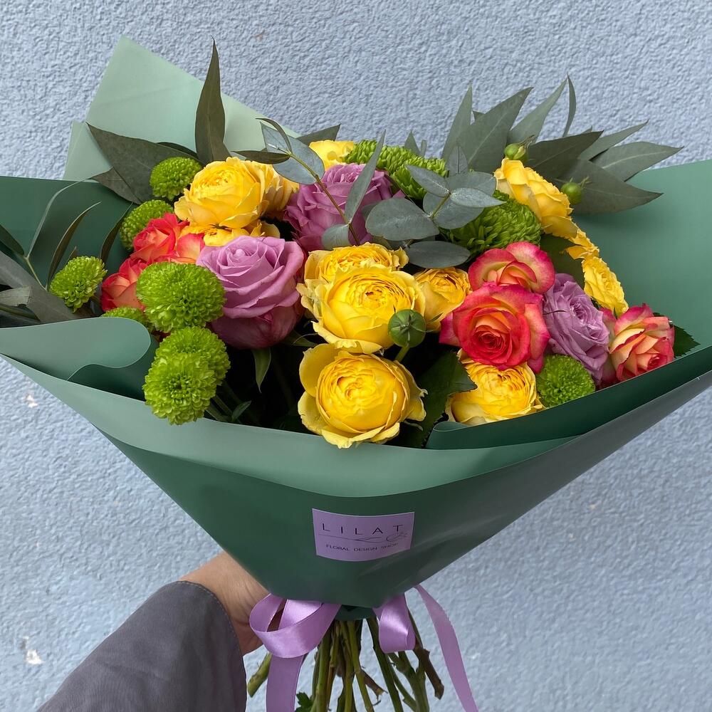 Кустовая роза – 6 шт. Кустовая хризантема – 3 шт. Открыточка с вашими пожеланиями – 1 шт. Эвкалипт Микс – 4 шт. бумага дизайнерская – 2 шт. розы – 3 шт.