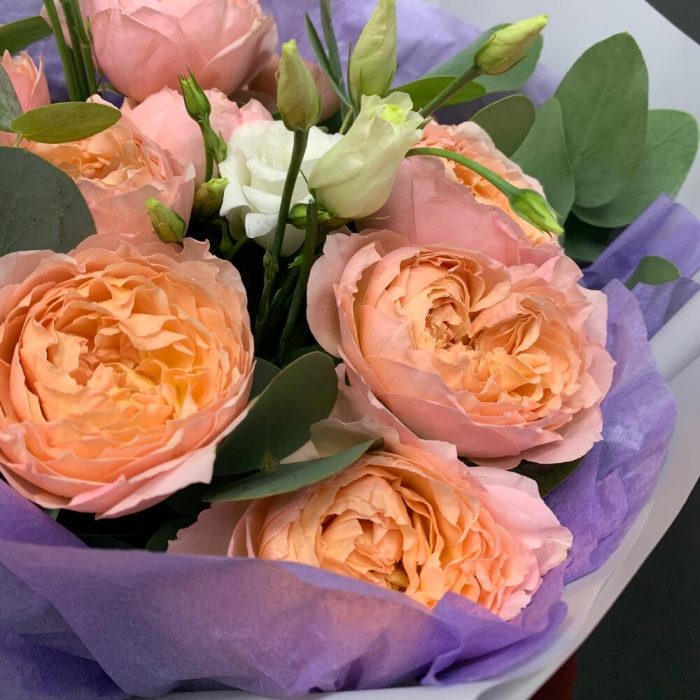 Эвкалипт – 5 шт.Лента атласная – 2 шт.Тишью – 1 шт.Лизиантус белый – 3 шт.Упаковка корейская пленка – 1 шт.роза кустовая пионовидная премиум джульетта – 3 шт.