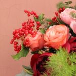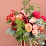 Калина – 1 шт.Роза пионовидная – 8 шт.Роза пионовидная кустовая – 2 шт.Аспарагус – 2 шт.Эвкалипт – 3 шт.Фисташка – 2 шт.Лента атласная – 3 шт.