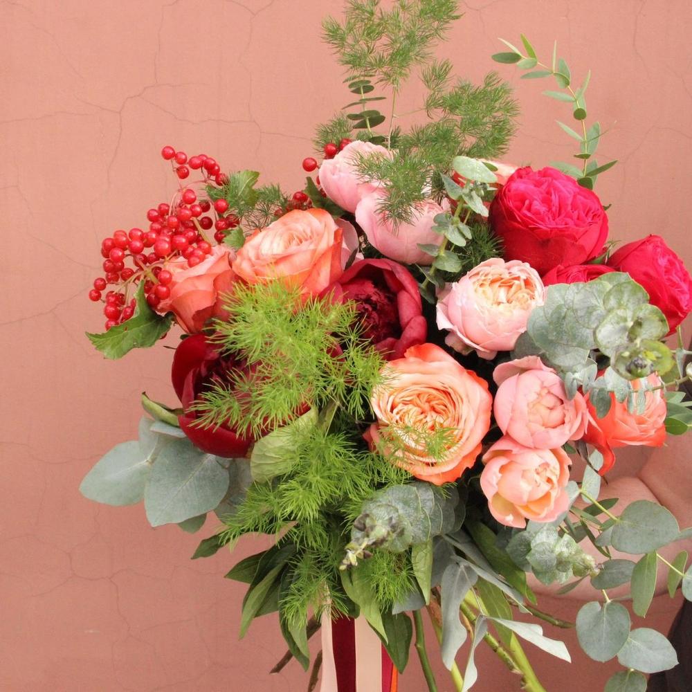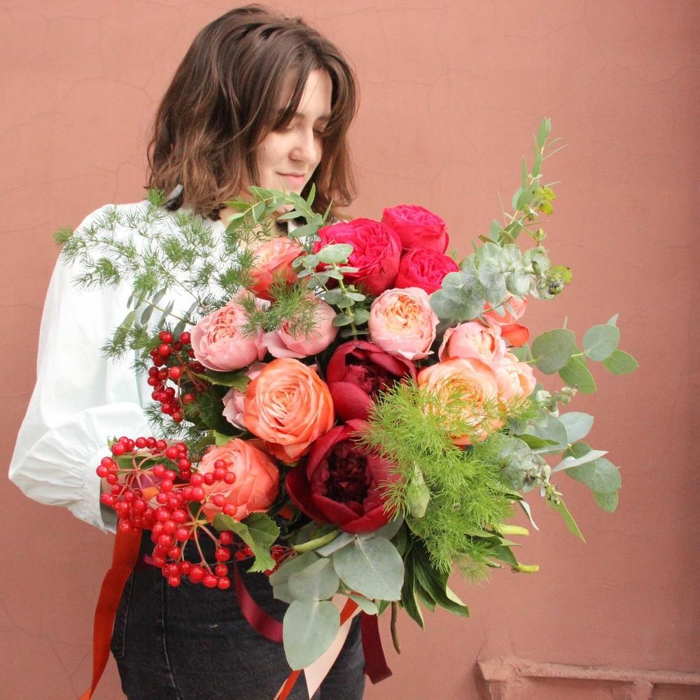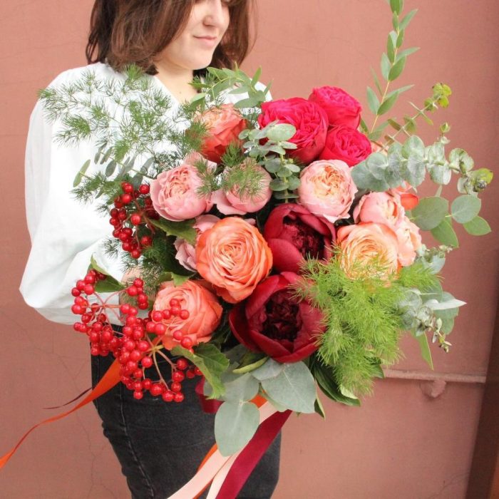 Яркий красочный букет с пионовидными розами, калиной, эвкалиптом и аспарагусом .Стильное цветочное решение для любого случая.