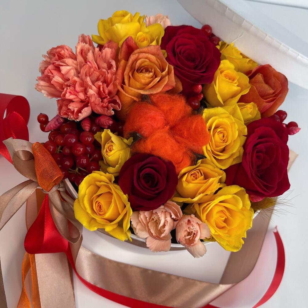 Хлопок – 1 шт.Кустовая роза – 2 шт.Лента атласная – 6 шт.Диантус – 1 шт.Коробка – 1 шт.Красная роза – 3 шт.Диантус кустовой – 1 шт.Калина красная – 1 шт.