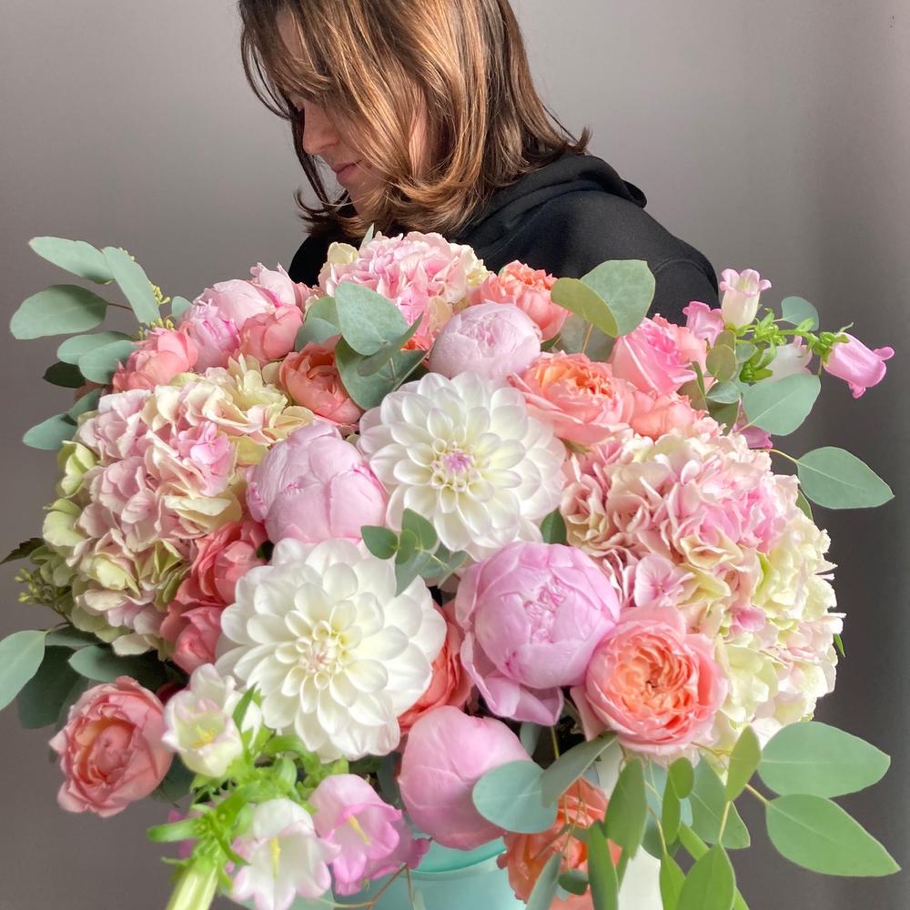 Гортензия – 3 шт.Роза кустовая пионовидная – 7 шт.Пион – 5 шт.Колокольчик – 5 шт.Георгина – 3 шт.Эвкалипт – 5 шт.Шляпная коробка – 1 шт.Лента атласная – 2 шт.Тишью – 2 шт.Оазис флористический – 2 шт.
