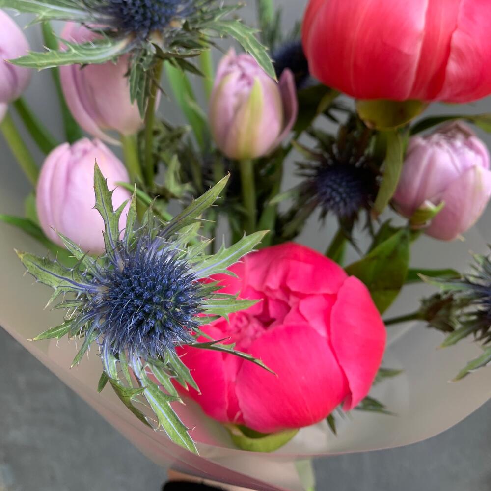 Авторский букет с пионами тюльпанами и эрингиумом / 1378 id